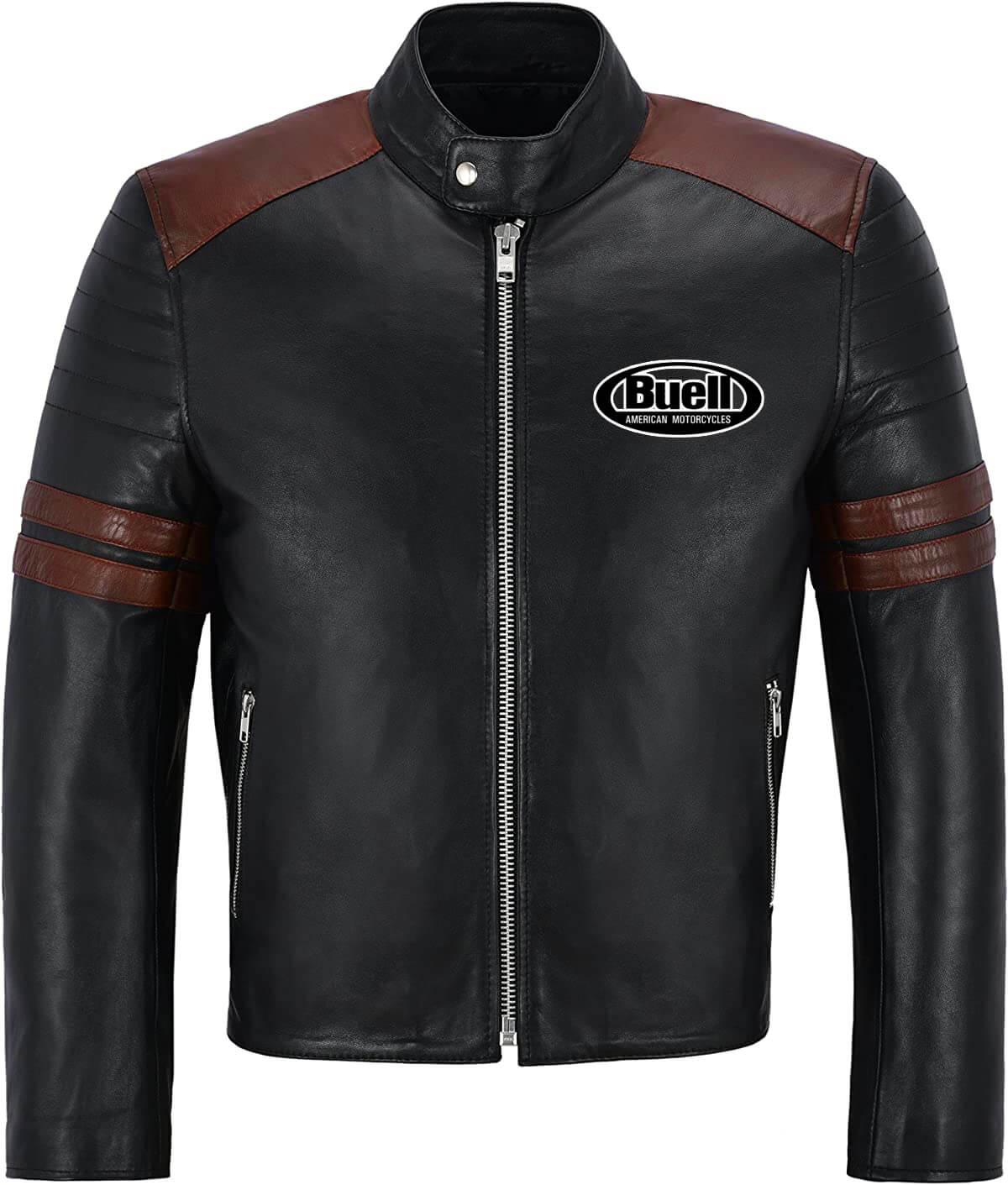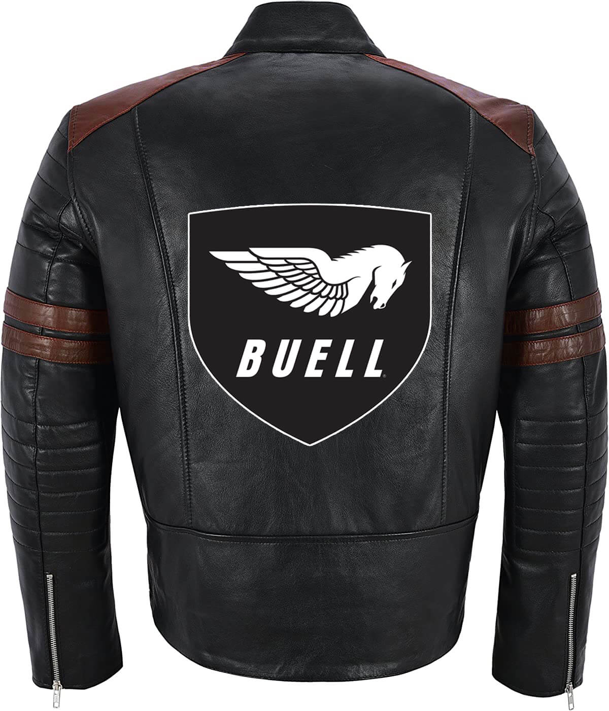 This “Black Brown Buell Motorcycle Racing Leather Jacket” is made from high-quality leather material. It has an inner lined soft and comfortable Viscose stitched that keeps you warm in the cold and chilly weather. It has a YKK Branded Zipper Style for its closure with a Snap Style collar that makes it a retro classic. The Jacket has a Black and Brown color that makes it stand out. The Zipper cuffs and Straight Line hemline also look attractive. The Jacket has Two Side Zipper pockets. Buell Motorcycle Logo on the left chest and on the back looks very beautiful. The Jacket is durable to wear due to its fine-quality stitching.