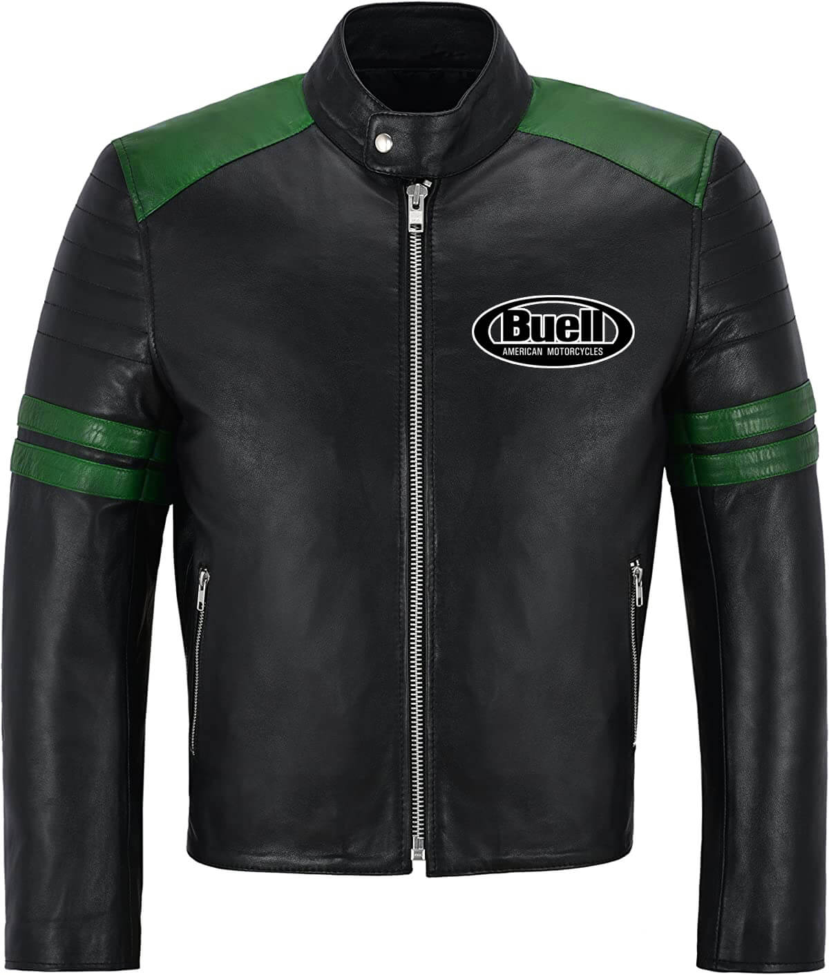 This “Black Green Buell Motorcycle Racing Leather Jacket” is made from high-quality leather material. It has an inner lined soft and comfortable Viscose stitched that keeps you warm in the cold and chilly weather. It has a YKK Branded Zipper Style for its closure with a Snap Style collar that makes it a retro classic. The Jacket has a Black and Green color that makes it stand out. The Zipper cuffs and Straight Line hemline also look attractive. The Jacket has Two Side Zipper pockets. Buell Motorcycle Logo on the left chest and on the back looks very beautiful. The Jacket is durable to wear due to its fine-quality stitching.