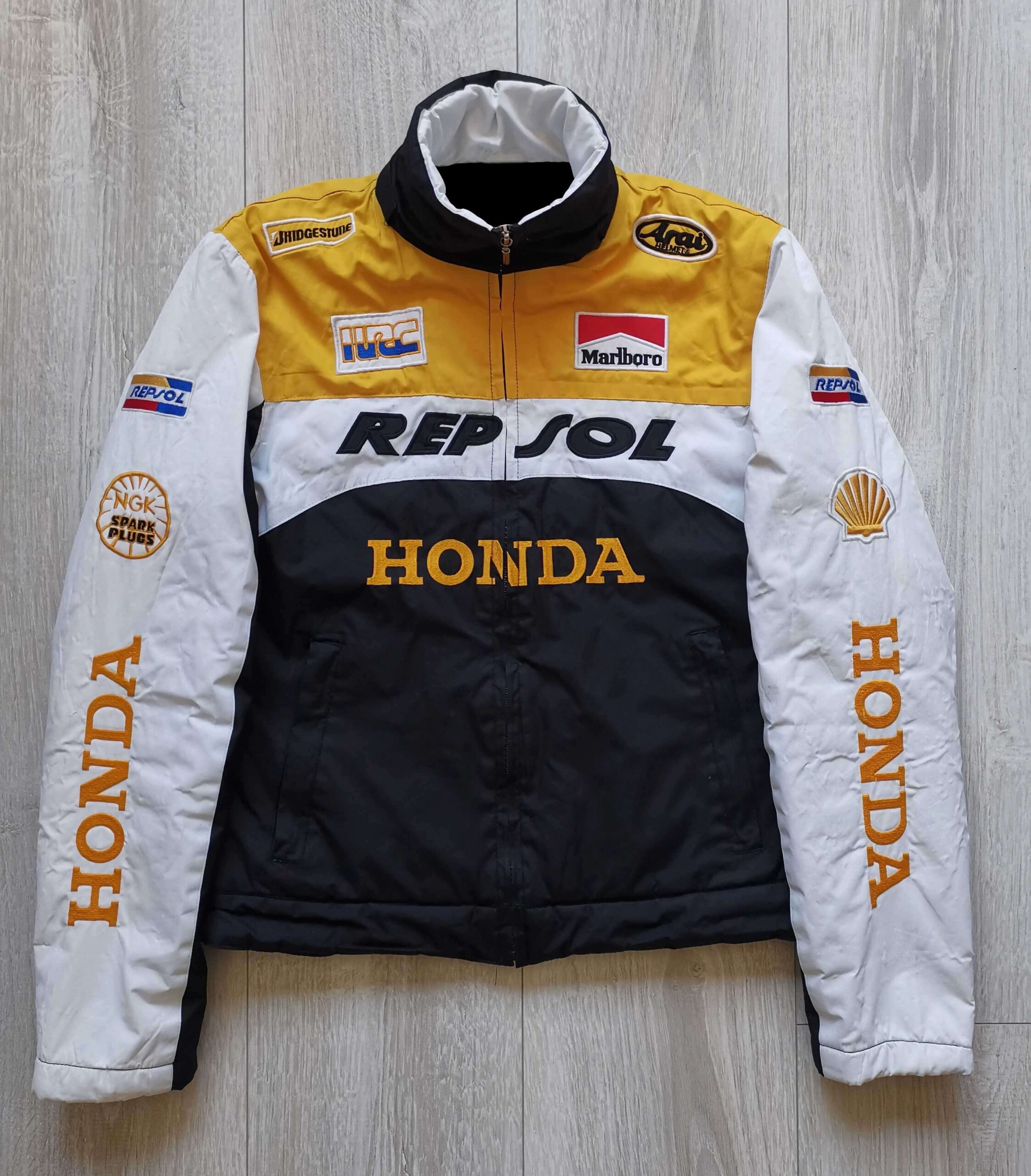 This “Black White Honda Repsol Motorcycle Racing Textile Jacket” is made from high-quality polyester material. It has an inner lined soft and comfortable Mesh polyester stitched that keeps you warm in the cold and chilly weather. It has a front YKK Branded Zipper style for its closure with a Zip up collar that makes it a retro classic. The Jacket has a Black, White, and Yellow color that makes it stand out. The Zipper cuffs also look attractive. The Jacket has Two Side Zipper pockets looks very beautiful. The jacket is durable to wear due to its fine quality stitching.
