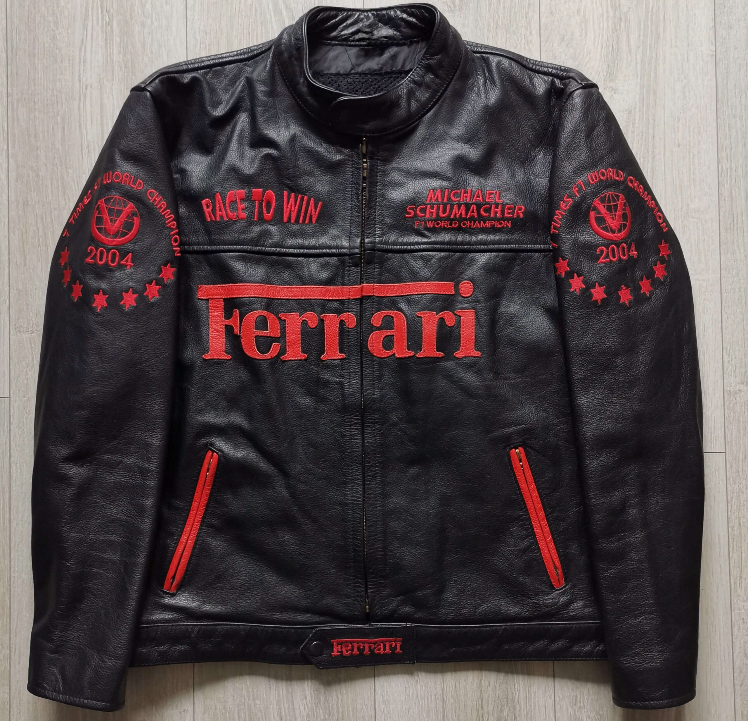 This “Ferrari Motorcycle Racing Black Leather Jacket” is made from high-quality leather material. It has an inner lined soft and comfortable Mesh polyester stitched that keeps you warm in the cold and chilly weather. It has a front YKK Branded Zipper style for its closure with a Snap collar that makes it a retro classic. The Jacket has a Black and Red color that makes it stand out. The Zipper cuffs also look attractive. The Jacket has Two Side Zipper pockets. Ferrari Motorcycle Logo on the back. The jacket is durable to wear due to its fine quality stitching.
