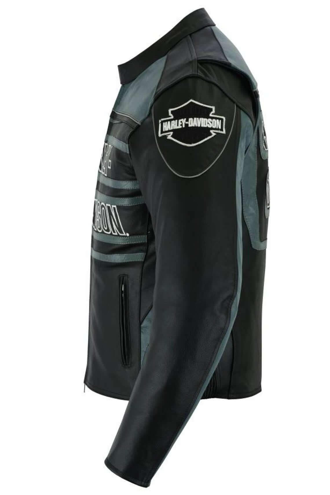 This Harley Davidson Marker Black Leather Jacket is made from high-quality leather material. It has an inner lined soft and comfortable viscose stitched that keeps you warm in the cold and chilly weather. The Jacket has a front YKK branded zipper for its closure with a snap collar that makes it a retro classic. The jacket has a black and gray color that makes it stand out. The zipper cuffs also look attractive. The Jacket has Two Front pockets to keep the stuff secure. Harley Davidson logo on the sleeves. The jacket is durable to wear due to its fine quality stitching.