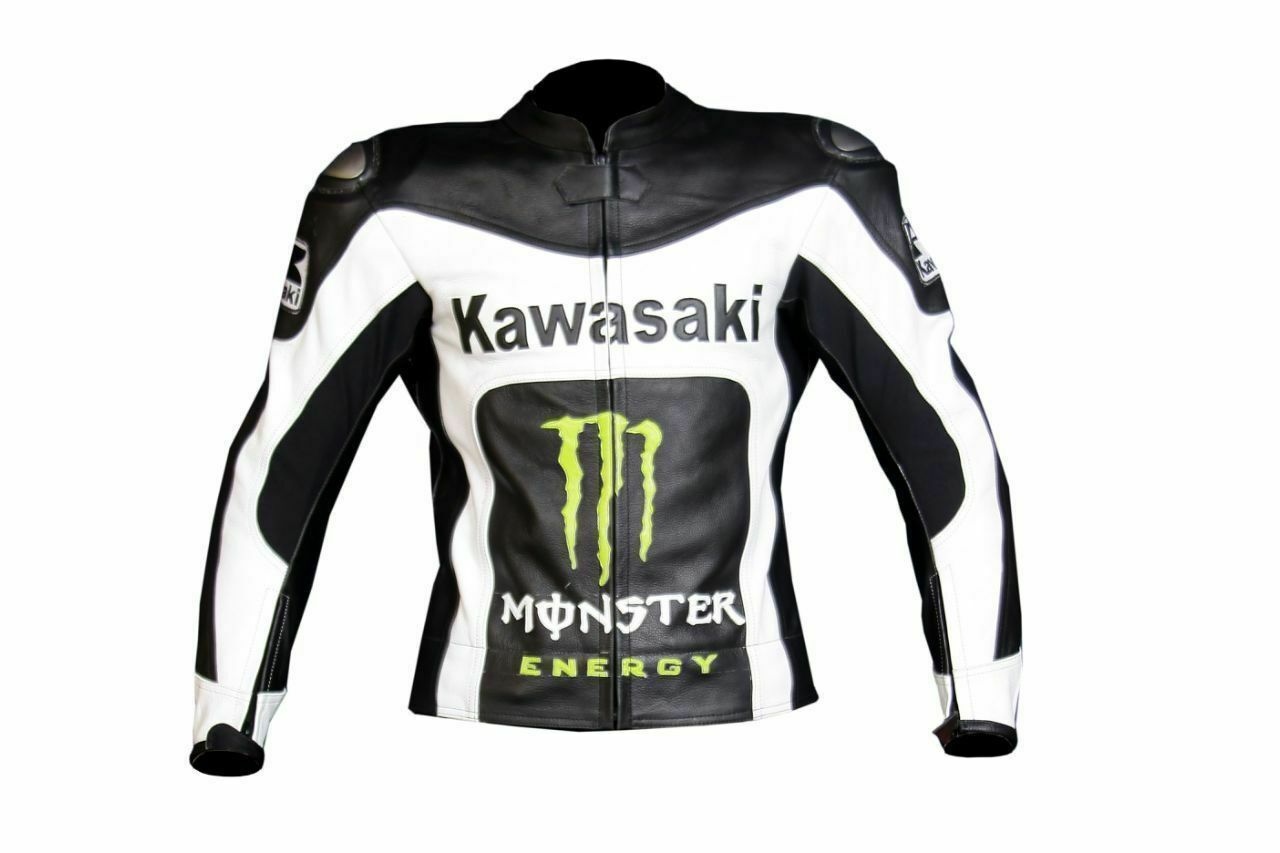 Kawasaki Black White Racing Motorcycle Leather Jacket With Safety Pads
