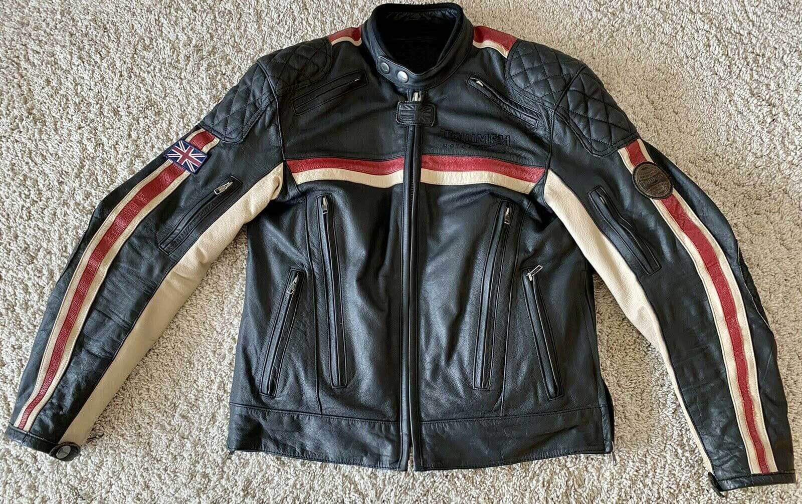 This “Triumph Motorcycle Black And White Racing Leather Jacket” is made from high-quality leather material. It has an inner lined soft and comfortable Mesh polyester stitched that keeps you warm in the cold and chilly weather. It has a front YKK Branded Zipper style for its closure with a Snap collar that makes it a retro classic. The Jacket has a Black, White, and Red color that makes it stand out. The Zipper with Snap cuffs also looks attractive. The Jacket Two Side Zipper pockets. The jacket is durable to wear due to its fine quality stitching.