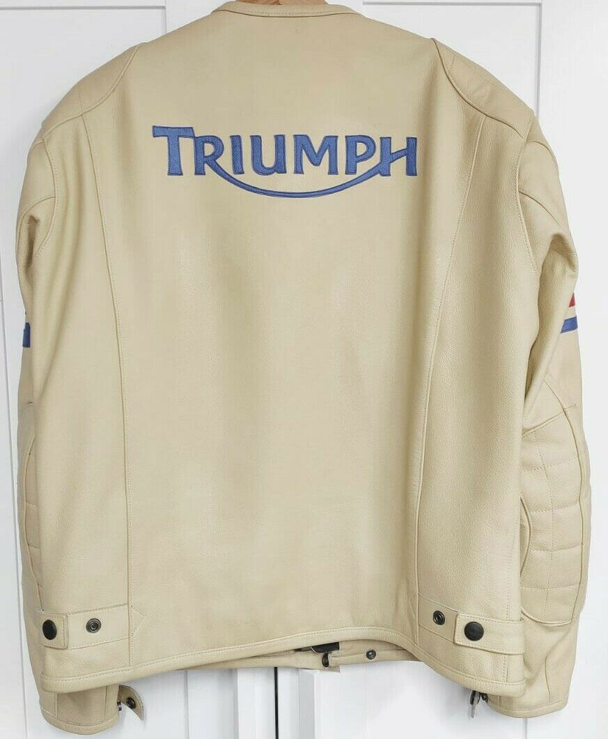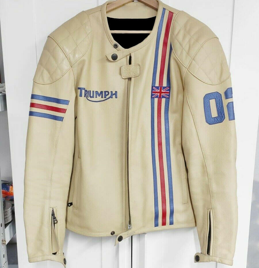 This “Triumph Motorcycle White Leather Jacket” is made from high-quality leather material. It has an inner lined soft and comfortable Mesh polyester stitched that keeps you warm in the cold and chilly weather. It has a front YKK Branded Zipper style for its closure with a Snap collar that makes it a retro classic. The Jacket has a White, Blue, And Red color that makes it stand out. The Zipper with Snap cuffs also looks attractive. The Jacket Two Side Zipper pockets. The jacket is durable to wear due to its fine quality stitching.